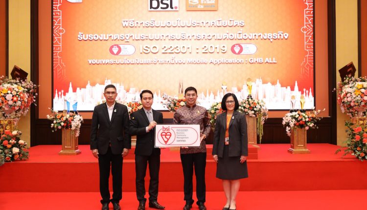 นายฉัตรชัย ศิริไล กรรมการผู้จัดการ ธนาคารอาคารสงเคราะห์ (ธอส.) นางสมจิตต์ รถทอง รองกรรมการผู้จัดการ กลุ่มงานเทคโนโลยีสารสนเทศ ธอส. และนายคณินรัส ทัพพะรังสี ผู้อำนวยการฝ่ายบริหารความเสี่ยง ธอส. เป็นผู้แทนธนาคารร่วมรับมอบใบประกาศนียบัตรรับรองมาตรฐาน ISO 22301 ระบบการบริหารความต่อเนื่องทางธุรกิจ (Business Continuity Management System : BCMS) ขอบเขตระบบโอนเงินและชำระหนี้ของ Mobile Application : GHB ALL จากบริษัท บีเอสไอ กรุ๊ป (ประเทศไทย) จำกัด โดยมีนายบุคลากร ใจดี General Manager – Sales and Marketing บริษัท บีเอสไอ กรุ๊ป (ประเทศไทย) จำกัด บริษัทชั้นนำของโลกในการตรวจประเมินออกใบรับรอง และให้บริการฝึกอบรมด้านระบบการจัดการมาตรฐานเป็นผู้มอบใบประกาศนียบัตรรับรองมาตรฐานให้กับ ธอส. ซึ่งนับเป็นองค์กรแห่งแรกในประเทศไทยที่ได้รับการรับรองมาตรฐาน ISO 22301 : 2019 ซึ่งถือเป็น version ล่าสุด สะท้อนให้เห็นถึงกระบวนการบริหารความต่อเนื่องทางธุรกิจของธนาคารเป็นไปตามมาตรฐานสากล มีความพร้อมรับมือต่อเหตุการณ์ฉุกเฉิน หรือภาวะวิกฤตที่อาจเกิดขึ้น ยกระดับการบริหารความต่อเนื่องทางธุรกิจ เพื่อสร้างความเชื่อมั่นให้กับลูกค้า และผู้มีส่วนได้ส่วนเสียในการใช้บริการโอนเงินและชำระหนี้ผ่าน Mobile Application : GHB ALL ของ ธอส. ทั้งนี้ พิธีรับมอบดังกล่าวจัดขึ้น ณ ห้องวิมานเมฆ ธอส. สำนักงานใหญ่ เมื่อเร็ว ๆ นี้