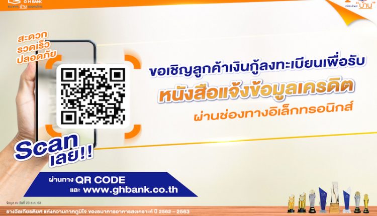 ธนาคารอาคารสงเคราะห์(ธอส.) เพิ่มความสะดวกให้กับลูกค้าสินเชื่อ พัฒนาช่องทางในการรับ “หนังสือแจ้งข้อมูลเครดิตแบบออนไลน์” แทนการรับเอกสารทางไปรษณีย์ เพียงลูกค้าเข้าไปลงทะเบียนเพื่อรับข้อมูลเครดิตผ่านลิงค์ที่ธนาคารส่งทางข้อความ SMS จาก GHBank เมื่อวันอังคารที่ 29 ธันวาคม 2563 ระหว่างเวลา 14.00-18.00 น. หรือสแกน QR Code ทาง www.ghbank.co.th เพื่อเข้าไปกรอกข้อมูลสำหรับลงทะเบียนการใช้งานรวมถึงอีเมลในการรับ Username และ Password สำหรับใช้ในการ ดาวน์โหลดหนังสือแจ้งข้อมูลเครดิตผ่านทาง www.ghbank.co.th โดยท่านสามารถดาวน์โหลดหนังสือแจ้งข้อมูลเครดิต ได้ตั้งแต่วันที่ 20 มกราคม 2564 เป็นต้นไป สอบถามรายละเอียดเพิ่มเติมได้ที่ ธอส. ทุกสาขา ทั่วประเทศ หรือ ศูนย์ลูกค้าสัมพันธ์ (Call Center) โทร 0-2645-9000 และ Facebook Fanpage ธนาคารอาคารสงเคราะห์