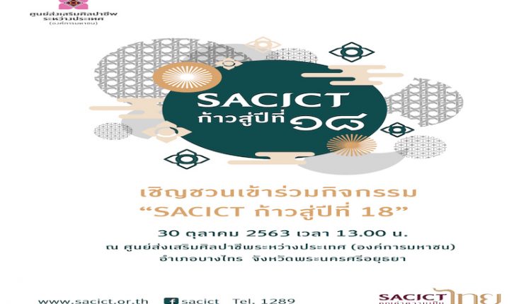 ศูนย์ส่งเสริมศิลปาชีพระหว่างประเทศ (องค์การมหาชน) หรือ SACICT จัดกิจกรรม “SACICT ก้าวสู่ปีที่ 18” มุ่งมั่นสืบสาน รักษา และต่อยอดคุณค่าในงานศิลปาชีพและหัตถกรรมไทย ผ่านการพัฒนาศักยภาพสมาชิกศิลปาชีพและผู้ประกอบการหัตถกรรมไทย ให้เกิดการสร้างงานกระจายรายได้ให้ชุมชนขับเคลื่อนเศรษฐกิจฐานรากของประเทศ การพัฒนาผลิตภัณฑ์ให้สวยงามทันสมัย และส่งเสริมด้านการตลาดให้สอดคล้องกับพฤติกรรมของผู้บริโภคในปัจจุบัน เดินหน้าพัฒนาวงการศิลปหัตถกรรมไทยให้สามารถก้าวสู่การยอมรับในนานาชาติ ด้วยการเพิ่มขีดความสามารถในการแข่งขันสร้างสรรค์งานหัตถกรรมไทยในมิติใหม่ พร้อมจับมือ 3 หน่วยงาน ได้แก่ สถาบันพัฒนาอุตสาหกรรมสิ่งทอ ศูนย์นาโนเทคโนโลยีแห่งชาติ และบริษัท ห้องปฎิบัติการกลาง (ประเทศไทย) จำกัด ยกระดับมาตรฐานและเพิ่มมูลค่าผลิตภัณฑ์ พร้อมขยายโอกาสทางการตลาดแก่งานศิลปาชีพและงานหัตถกรรมไทยให้เป็นที่ยอมรับในระดับสากล ขอเชิญชวนร่วมกิจกรรม และร่วมชมหอนิทรรศการพร้อมเลือกซื้อผลิตภัณฑ์ศิลปาชีพและหัตถกรรมไทย ในวันศุกร์ที่ 30 ตุลาคม 2563เวลา 13.00-16.00 น. ณ ศูนย์ส่งเสริมศิลปาชีพระหว่างประเทศ (องค์การมหาชน) อำเภอบางไทร จังหวัดพระนครศรีอยุธยา สอบถาม โทร 1289