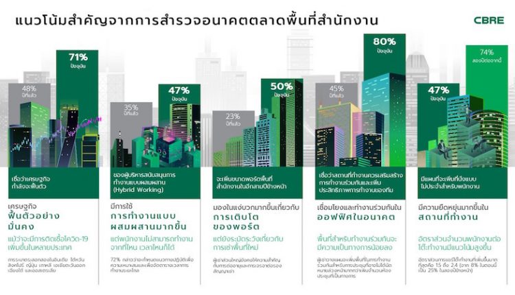 จากรายงานการสำรวจตลาดพื้นที่สำนักงานในอนาคตในเอเชียแปซิฟิก ปี 2564 ของซีบีอาร์อีที่เผยแพร่ในวันนี้ พบว่า บริษัทที่เป็นผู้เช่าพื้นที่สำนักงานวางแผนที่จะขยายพื้นที่สำนักงานในภูมิภาคเอเชียแปซิฟิกมากขึ้นในระยะยาว และนำกลยุทธ์เพื่อเพิ่มความยืดหยุ่นและการทำงานแบบผสมผสานในรูปแบบใหม่ ๆ หรือ Hybrid Workingมาใช้
