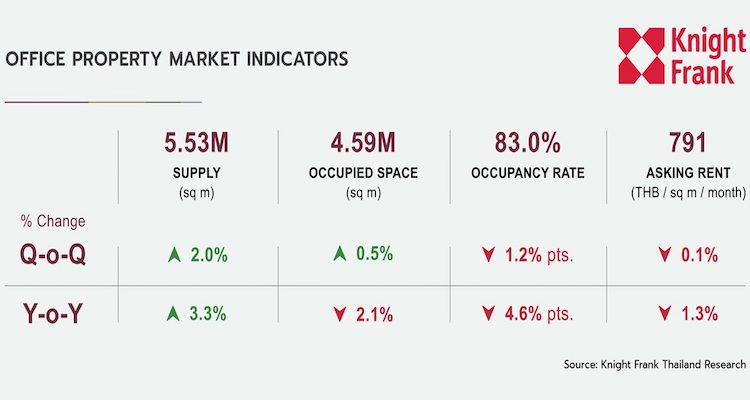 อัตราการครอบครองของตลาดลดลง 1.2% เป็น 83% ซึ่งเป็นอัตราการครอบครองที่ต่ำที่สุดของตลาดในช่วงทศวรรษที่ผ่านมา และเป็นไตรมาสที่ 9 ที่อัตราการครอบครองลดลงติดต่อกันอย่างต่อเนื่อง โดยเปรียบเทียบแล้ว อัตราการครอบครองเฉลี่ย 10 ปีอยู่ที่ 90% พื้นที่ทุกเกรดในตลาดอาคารสำนักงานยังคงมีผลประกอบการต่ำกว่าค่าเฉลี่ยระยะยาวของแต่ละเกรด แต่ที่น่าสนใจคือในขณะที่อัตราการครอบครองลดลง 1.5% สำหรับเกรด B และ 1.8% สำหรับเกรด C แต่กลับเพิ่มขึ้น 0.3% สำหรับเกรด A การเก็บค่าเช่าสำหรับพื้นที่เกรดA ที่ลดลงอาจเป็นปัจจัยดึงดูดผู้เช่าบางราย เพราะเป็นการเพิ่มความสามารถในการใช้จ่ายที่มากขึ้นของผู้เช่าที่ต้องการพื้นที่คุณภาพสูง