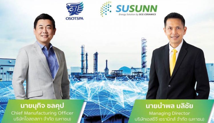 อนึ่ง บริษัท เอสซีจี เซรามิกส์ จำกัด (มหาชน) ภายใต้ แบรนด์ “SUSUNN” ดำเนินธุรกิจให้คำปรึกษา ออกแบบ จัดจำหน่ายและติดตั้งระบบผลิตกระแสไฟฟ้าจากพลังงานทดแทน ซึ่งเป็นพลังงานสะอาดหลากหลายประเภท โดยเฉพาะระบบโซล่าเซลล์ รวมทั้งบริการด้านการจัดการพลังงาน การตรวจรับรองและวิเคราะห์การใช้พลังงาน ตลอดจนพัฒนาระบบพลังงานทดแทนและระบบอนุรักษ์พลังงานภาคอุตสาหกรรม ข้อมูลเพิ่มเติม https://susunn.scgceramics.com
