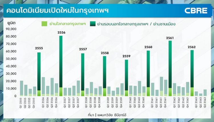 นายรัฐวัฒน์ คูวิจิตรสุวรรณ หัวหน้าแผนกวิจัยและที่ปรึกษาการพัฒนาโครงการ ซีบีอาร์อี ประเทศไทย เผยว่าปริมาณคอนโดมิเนียมที่เปิดตัวใหม่ในช่วง 9 เดือนแรกของปี 2563 ลดลงเหลือ 18,630 ยูนิต คิดเป็นลดลง 56.6% จากปีที่แล้ว เนื่องจากผู้พัฒนาโครงการได้มีการปรับกลยุทธ์ใหม่และมุ่งเน้นไปที่การสร้างรายได้แบบรวดเร็วเพื่อจัดการกับกระแสเงินสดในช่วงเวลาที่ท้าทายเช่นนี้ และยังพบว่ามีการลดราคาและการทำการส่งเสริมการขายสำหรับยูนิตเหลือขายที่พร้อมโอนกรรมสิทธิ์กันมากขึ้น โดยบางโครงการมีการลดราคากันถึง 20% – 25%