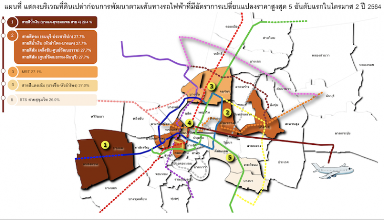 ทั้งนี้ จากรายงานพบว่าในไตรมาส 2 ปี 2564ราคาที่ดินเปล่าก่อนการพัฒนาในทำเลที่มีเส้นทางรถไฟฟ้าผ่าน 5 อันดับแรกที่มีอัตราการขยายตัวของราคาที่ดินเพิ่มขึ้นสูงสุด คือ (ดูตารางที่2 และแผนที่)