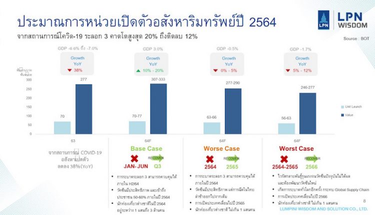 ภายใต้สมมติฐานดังกล่าว LPN Wisdom คาดว่า ตลาดอสังหาริมทรัพย์ในปี 2564 จะมีแนวโน้มติดลบ 5-6% เมื่อเทียบกับปี 2563 เป็นการติดลบต่อเนื่องเป็นปีที่สองจากปี 2563 ที่มีการเปิดตัวโครงการใหม่ติดลบ 37% เทียบกับปี 2562 โดยคาดว่าจะมีการเปิดตัวโครงการใหม่ในเขตกรุงเทพมหานครและปริมณฑล ในปี 2564 ประมาณ 65,000-66,000 หน่วย มูลค่าประมาณ 260,000-265,000 ล้านบาท