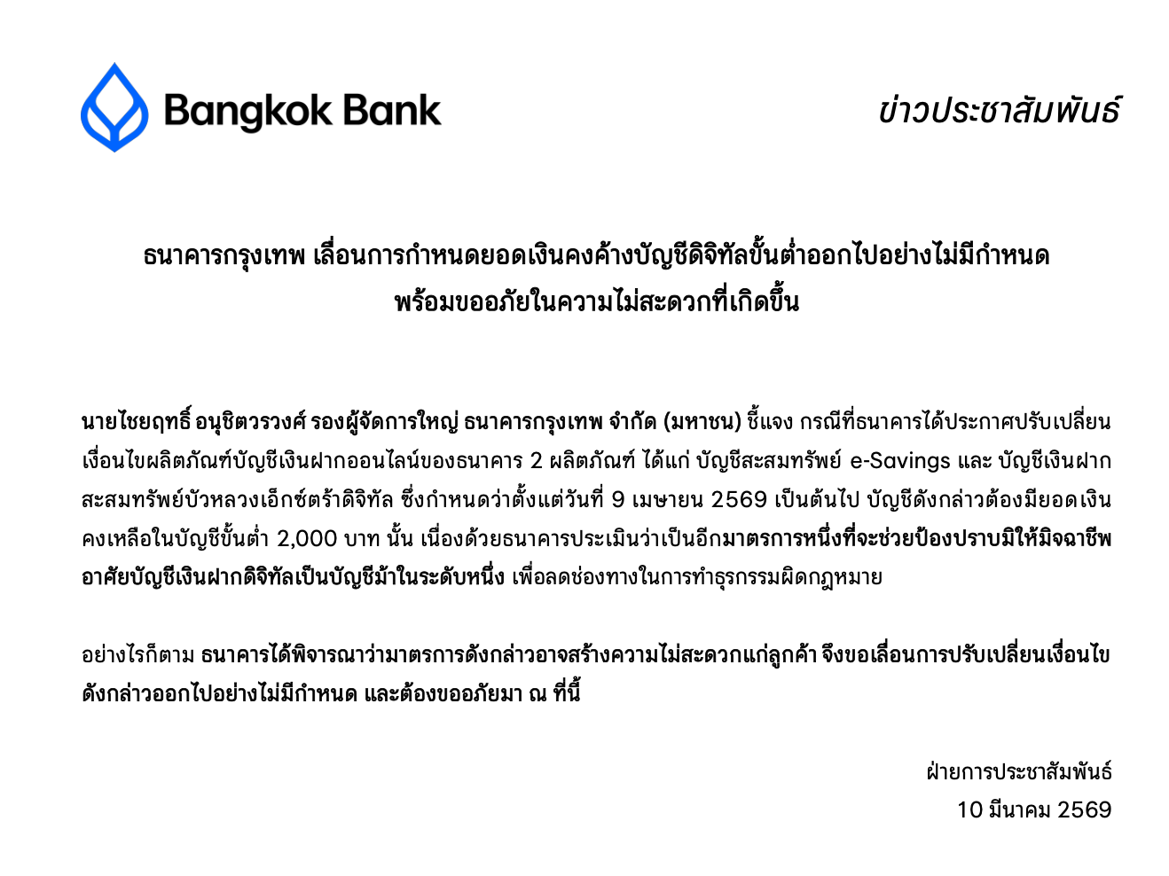 โดยกำหนดให้ตั้งแต่วันที่ 9 เมษายน 2569 เป็นต้นไป ต้องมียอดเงินคงเหลือขั้นต่ำ 2,000 บาท