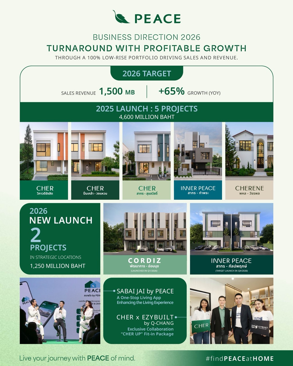 พีซแอนด์ลีฟวิ่ง (PEACE) ประกาศแผนธุรกิจปี 2569 ภายใต้กลยุทธ์ “TURNAROUND WITH PROFITABLE GROWTH” มุ่งพลิกความท้าทายสู่การเติบโตอย่างมีคุณภาพ พร้อมตั้งเป้ายอดขาย 1,500 ล้านบาท เติบโต 65% จากปีก่อน เดินหน้ารุกตลาดที่อยู่อาศัยแนวราบเต็มรูปแบบ เตรียมเปิด 2 โครงการใหม่ มูลค่ารวม 1,250 ล้านบาท ชูทำเลใกล้รถไฟฟ้า และยกระดับประสบการณ์ลูกบ้านผ่านเทคโนโลยีและแนวคิด ESG