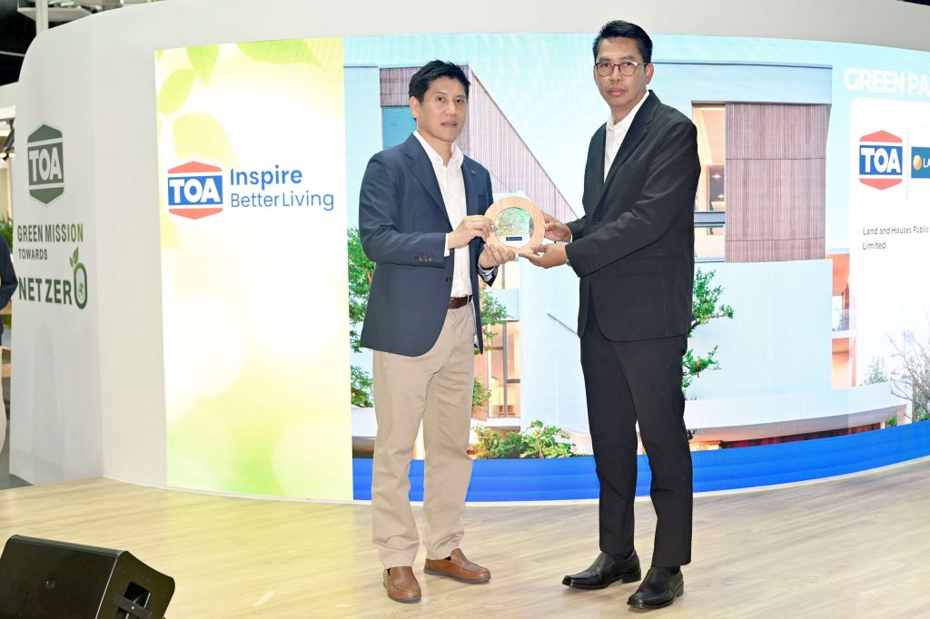 คุณสุธาร ศรีสุข ผู้จัดการฝ่าย ฝ่ายก่อสร้าง บริษัท แลนด์ แอนด์ เฮ้าส์ จำกัด (มหาชน) เป็นผู้แทนบริษัทฯ รับโล่ประกาศเกียรติคุณ GREEN MISSION จากคุณจตุภัทร์ ตั้งคารวคุณ ประธานเจ้าหน้าที่บริหาร บริษัท ทีโอเอ เพ้นท์ (ประเทศไทย) จำกัด (มหาชน) ในงาน “TOA GREEN MISSION TOWARDS NET ZERO เดินหน้าพันธกิจ พิชิต NET ZERO” จัดขึ้นเป็นครั้งแรกเมื่อวันที่ 30 เมษายน ที่ผ่านมา ซึ่งบริษัท แลนด์ แอนด์ เฮ้าส์ จำกัด (มหาชน) เป็นหนึ่งใน 14 องค์กรที่ได้รับโล่ประกาศเกียรติคุณ GREEN MISSION จากการสนันสนุนผลิตภัณฑ์ของ TOA และมีนโยบายมุ่งเน้นสู่ Net Zero เช่นเดียวกัน