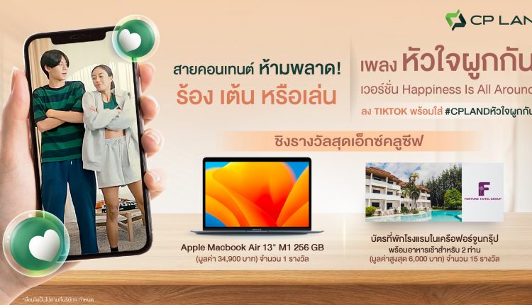 2 มีนาคม 2566, กรุงเทพฯ – บริษัท ซี.พี. แลนด์ จำกัด (มหาชน) หรือ CP LAND หนึ่งในผู้พัฒนาอสังหาริมทรัพย์ชั้นนำของประเทศไทย ขอเชิญชวนเพื่อนๆ ร่วมสร้างสรรค์วิดีโอคอนเทนต์ลงบน TikTok ไม่ว่าจะร้อง เล่น หรือ เต้น กับเพลง ‘หัวใจผูกกัน’ เวอร์ชั่น “Happiness is All Around” จาก ช่อง CPLAND.official ชิงรางวัลสุดเอ็กซ์คลูซีฟ Macbook Air M1 และบัตรที่พักสุดพิเศษจากโรงแรมในเครือฟอร์จูนกรุ๊ป 13 แห่งทั่วประเทศ ตั้งแต่วันนี้ จนถึง วันที่ 17 มีนาคม 2566