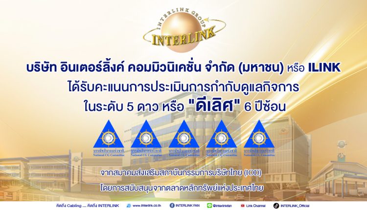บริษัท อินเตอร์ลิ้งค์ คอมมิวนิเคชั่น จำกัด (มหาชน) หรือ ILINK ได้รับคะแนนการประเมินการกำกับดูแลกิลกิจการในระดับ 5 ดาว หรือ “ดีเลิศ” (Excellent CG Scoring) เป็นปีที่ 6 ต่อเนื่องติดต่อกัน จากสมาคมส่งเสริมสถาบันกรรมการบริษัทไทย (IOD) โดยการสนับสนุนจากตลาดหลักทรัพย์แห่งประเทศไทย และสำนักงานคณะกรรมการกำกับหลับหลักทรัพย์และตลาดหลักทรัพย์ (ก.ล.ต.) ในโครงการสำรวจการกำกับดูแลกิจการของบริษัทจดทะเบียนไทย ประจำปี 2567 (Corporate Governance Report of Thai Listed Companies: CGR) โดยในปี 2567 มีบริษัทจดทะเบียนเข้าร่วมการประเมินทั้งสิ้น 808 บริษัท