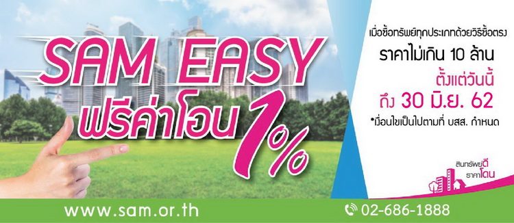 เลือกทรัพย์มือสองทำเลใช่ ราคาโดนกับ SAM ใจดีขยายเวลาโปรดีๆ “SAM Easy ฟรีค่าโอน 1%” ต้อนรับสงกรานต์ เริ่มวันนี้ ถึง 30 มิ.ย.62 ศกนี้ พร้อมโบนัสพิเศษ “SAM จัดให้” แด่ลูกค้าคนสำคัญ