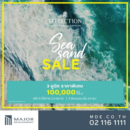 ซัมเมอร์นี้ เมเจอร์ ดีเวลลอปเม้นท์ นำโดยผู้บริหารหญิงคนเก่ง คุณเพชรลดา พูลวรลักษณ์ กรรมการบริหาร ส่ง “รีเฟล็คชั่น จอมเทียน บีช พัทยา” คอนโดฯ ไฮไรส์ซุเปอร์ลักชัวรี่ติดหาดจอมเทียนสุดฮอต ส่วนกลางจัดเต็มกว่า 40 รายการ จัดโปรโมชั่นเด็ดท้าลมร้อน “Sea Sand Sale” คัด 3 ยูนิตพิเศษ 3 ห้องนอน ไซส์บิ๊ก ขนาดเริ่มต้น 217.55 ตร.ม. ห้องวิวทะเล 180 องศา ลดราคาสูงสุดกว่า 4 ล้านบาท พร้อมฟรีค่าใช้จ่าย 3 ต่อ 1.ฟรีค่าส่วนกลาง 18 เดือน 2.ฟรีค่าธรรมเนียมการโอนฯ 3.ฟรีค่ากองทุนแรกเข้า พลาดไม่ได้! วันนี้ถึง 15 พ.ค.นี้เท่านั้น สนใจลงทะเบียนรับสิทธิพิเศษคลิก http://bit.ly/seasandsale หรือ สอบถามข้อมูลเพิ่มเติมได้ที่MajorDevelopment Contact Center โทร. 02-116-1111