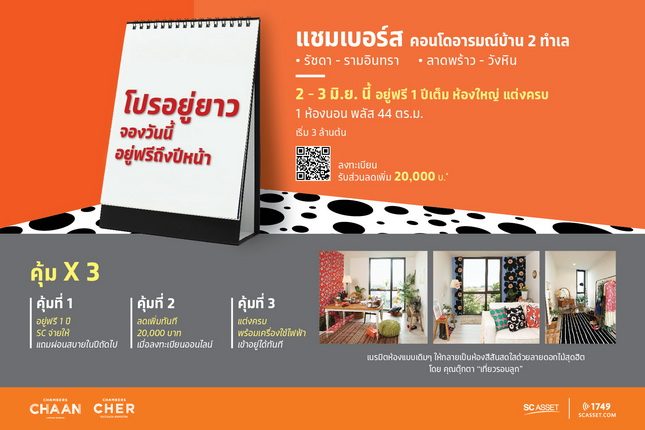 เอสซีฯ ส่ง 2โครงการ แชมเบอร์ส เฌอ รัชดา-รามอินทรา (CHAMBERS CHER) สไตล์เดนิชโมเดิรน์ โดดเด่นด้วยคลับเฮ้าส์ 2 ชั้น เสมือนห้องนั่งเล่นกลางสวน พร้อมห้องออกกำลังกายชั้นบน ส่วนอีกโครงการคือ แชมเบอร์ส ชาน ลาดพร้าว-วังหิน (CHAMBERS CHAAN) ทำเลสะดวกที่เชื่อมต่อถนนหลักหลายเส้นทาง พร้อมส่วนกลางแบบจัดเต็ม พิเศษ! พบกับโปรสุดคุ้มx3 สำหรับ 1 ห้องนอนพลัส 44 ตร.ม. แต่งครบ พร้อมเครื่องใช้ไฟฟ้า และฟรีค่าใช้จ่ายวันโอน* ราคาเริ่ม 3 ล้านต้น พิเศษด้วยแคมเปญ “โปรอยู่ยาว จองวันนี้ อยู่ฟรีถึงปีหน้า” อยู่ฟรี 1 ปี และผ่อนสบายๆ ในปีที่ 2-3 พบกันที่สำนักงานขายโครงการ สำหรับผู้ที่สนใจสามารถลงทะเบียนผ่าน QR code หรือลิ้งค์ https://goo.gl/NYVR3G ได้รับส่วนลดเพิ่มอีก 20,000 บาท* รายละเอียดเพิ่มเติมโทร 1749 หรือ www.scasset.com