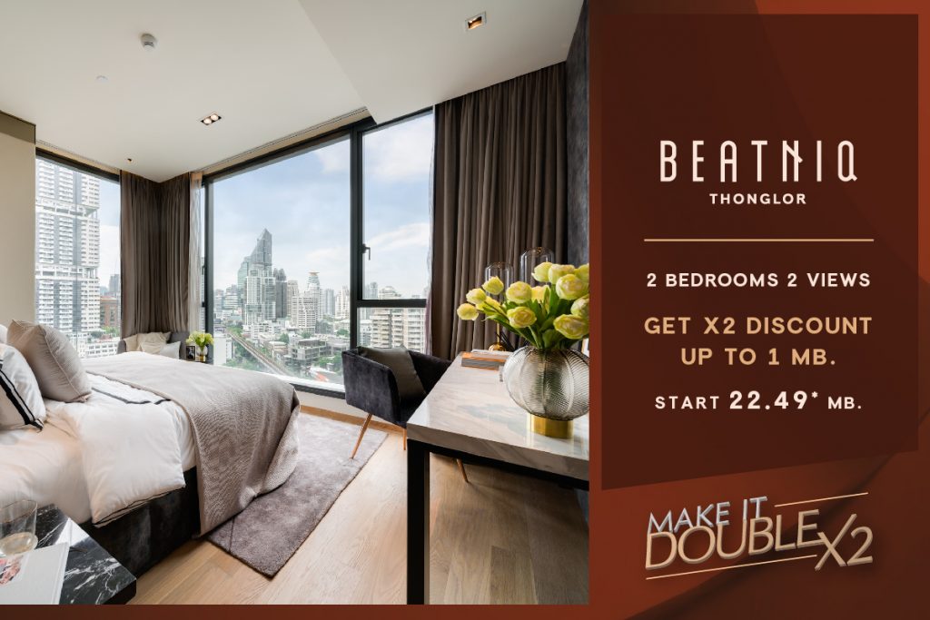 BEATNIQ Thonglor (บีทนิค ทองหล่อ) คอนโดมิเนียมระดับ ลักซ์ชัวรี ใจกลางย่านธุรกิจสำคัญอย่างทองหล่อและพร้อมพงษ์ เพียง 250 เมตร ถึง BTS สถานี ทองหล่อ ให้ชีวิตสะดวกสบาย ไม่เหมือนใคร ด้วยส่วนกลางที่โดดเด่นและดีไซน์แบบ Mid-Century Modern ที่เป็นเอกลักษณ์ ใจกลางสุขุมวิท จัดแคมเปญพิเศษ กับ “Make It Double!!” ที่อยากให้ทุกคนได้มาสัมผัสประสบการณ์ที่พิเศษ และไม่เหมือนใครกับโปรโมชั่นสุดพิเศษ 2 ห้องนอน ที่ลงตัวที่สุด กับวิวเมืองสุขุมวิท และบางกระเจ้า พร้อมรับสิทธิพิเศษเป็น 2 เท่า มูลค่าสูงสุด 1,000,000* บาท เมื่อจองโครงการและโอนกรรมสิทธิ์ ภายในเมษายน 2563 ราคาเริ่มต้น 22.49* ล้านบาท