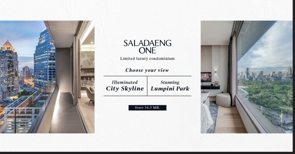 SALADAENG ONE (ศาลาแดง วัน) คอนโดมิเนียม ซุปเปอร์ ลักซ์ชัวรี ฟรีโฮสด์หนึ่งเดียวใจกลางย่าน Central Lumpini ตั้งอยู่ในทำเลศักยภาพย่านธุรกิจใจกลางเมือง ห่างจากสวนลุมพินีเพียง 120 เมตร ห้องพักและส่วนกลางรับวิวสวนลุมพินีแบบเต็มตา วิวเมืองและวิวโค้งน้ำบางกระเจ้า จัดแคมเปญพิเศษ “Choose Your Views” เลือกเป็นเจ้าของ 2 ห้องนอน ขนาด 108-130 ตรม. พร้อมวิวสวนและวิวแม่น้ำเจ้าพระยา ในราคาเริ่มต้น 36.5 ล้านบาท, และ 2 ห้องนอนวิวเมืองย่านธุรกิจในราคาเริ่มต้น 34.5 ล้านบาท