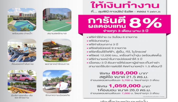 วันนี้ LPN มีสิ่งดีๆ มานำเสนอสำหรับท่านที่มองหาการลงทุนเพื่อให้เงินทำงาน ในแคมเปญ “ให้เงินทำงานที่…ลุมพินี ทาวน์ชิป รังสิต-คลอง 1 การันตีผลตอบแทน (Yield) สูงสุด 8% จ่ายทุก 3 เดือน นาน3 ปี” ราคาเริ่มต้น 859,000บาท ห้องสตูดิโอ ขนาด 21.5 ตร.ม. ได้รับผลตอบแทนเดือนละ 5,700 บาท จ่ายทุก 3 เดือน (เช่น 5,700×3 = 17,100 บาท) หักภาษี ณ ที่จ่าย 3%
