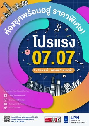 บริษัท ลุมพินี พรอพเพอร์ตี้ มาเนจเมนท์ จำกัด (LPP) ผู้ดำเนินธุรกิจให้บริการบริหารชุมชนแบบครบวงจรอย่างมืออาชีพ จัดทีม Condo Lumpini Brokerage ที่ปรึกษาและบริการบริหารทรัพย์สินฝากขายเช่าในทุกโครงการ ชวนเจ้าของร่วมที่สนใจรับบริการฝากขาย-เช่า ส่งห้องชุดพร้อมอยู่ทุกโครงการในเครือ บริษัท แอล.พี.เอ็น. ดีเวลลอปเมนท์ จำกัด (มหาชน) (LPN) ย่านใจกลางเมืองและทุกทำเลทั่วกรุง และร่วมเสิร์ฟ “ โปรแรง 07/07 ” ซื้อ ลดสูงสุด 200,000 บาท เช่า ลดสูงสุด 15% กว่า 20 โครงการ (เฉพาะโครงการและยูนิตที่ร่วมโปรโมชั่นเท่านั้น