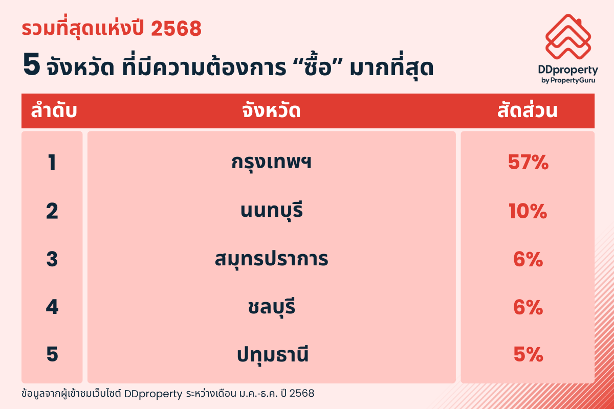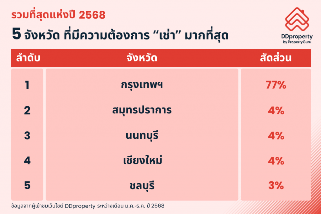 ตลอดปี 2568 พบว่า กรุงเทพมหานคร ยังคงครองอันดับ 1 จังหวัดที่มีความต้องการซื้อและเช่าที่อยู่อาศัยสูงสุด สะท้อนบทบาทของเมืองหลวงในฐานะศูนย์กลางเศรษฐกิจ การทำงาน และไลฟ์สไตล์