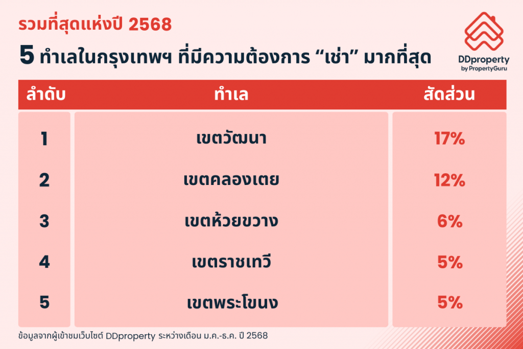 เมื่อเจาะลึกลงในกรุงเทพฯ พบว่า เขตวัฒนา ยังคงเป็นทำเลยอดนิยมอันดับ 1 ทั้งตลาดซื้อและเช่าในปี 2568 ด้วยจุดแข็งด้านทำเลเศรษฐกิจที่รายล้อมด้วยอาคารสำนักงาน ร้านอาหาร แหล่งไลฟ์สไตล์ และระบบขนส่งมวลชนหลายสาย ทำให้ตอบโจทย์ทั้งชาวไทยและชาวต่างชาติที่มองหาที่อยู่อาศัยในย่านใจกลางเมือง