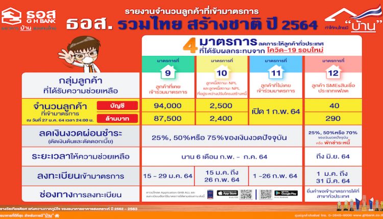 นายฉัตรชัย ศิริไล กรรมการผู้จัดการ ธนาคารอาคาร สงเคราะห์ (ธอส.) เปิดเผยว่า ภายหลังจากธนาคารได้จัดทำมาตรการช่วยเหลือลูกค้าที่ได้รับผลกระทบด้านรายได้จากการแพร่ระบาดของเชื้อไวรัสโคโรนา 2019 (COVID-19) ระลอกใหม่ตามนโยบายของกระทรวงการคลังผ่าน “โครงการธอส.รวมไทยสร้างชาติ ปี 2564” ด้วย 4 มาตรการ ลดเงินงวดผ่อนชำระ (เงินงวดที่ชำระจะตัดเงินต้นและตัดดอก เบี้ย) นานสูงสุด 6 เดือน โดยเริ่มเปิดให้ลูกค้าลงทะเบียนแจ้งความประสงค์ เข้ามาตร การระยะแรกผ่าน Application:GHB ALL ตั้งแต่วันที่ 15 มกราคม 2564 จำนวน 2 มาตรการ (M 9 และ M 10) และแจ้งความประสงค์เข้ามาตร การผ่านสาขา 1 มาตรการ (M12) ล่าสุด ณ วันที่ 27 มกราคม 2564 เวลา 24.00 น. มีลูกค้าลงทะเบียนแจ้งความประสงค์เข้ามาตร การรวมจำนวนกว่า 96,500 บัญชีเงินต้นคงเหลือ กว่า 90,000 ล้านบาทแบ่งเป็นมาตรการที่ 9 (M 9)