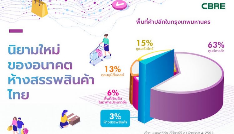 ห้างสรรพสินค้าถือเป็นสถานที่ที่คนไทยคุ้นเคยกันมานานหลายสิบปี แต่ปัจจุบัน ซีบีอาร์อี บริษัทที่ปรึกษาด้านอสังหาริมทรัพย์กลับมองเห็นถึงความนิยมที่ลดลงและมีการเติบโตเพียงเล็กน้อยในปี 2563 หลังจากโควิด-19 เกิดการระบาด ส่งผลกระทบโดยตรงต่อธุรกิจค้าปลีก ซีบีอาร์อีเชื่อว่า นอกจากจะต้องมีการปรับตัวให้เข้ากับอี-คอมเมิร์ซและสอดคล้องกับพฤติกรรมของผู้บริโภคที่เปลี่ยนแปลงไป ห้างสรรพสินค้าในปี 2564 จะต้องปรับรูปแบบการทำธุรกิจในแง่ของการสร้างเสริมประสบการณ์ใหม่ๆ ให้กับลูกค้าที่เข้ามาใช้บริการ รวมไปถึงการจัดกิจกรรมที่สร้างสรรค์ และบริการเสริม เพื่อรักษาความนิยมจากนักช้อปชาวไทย
